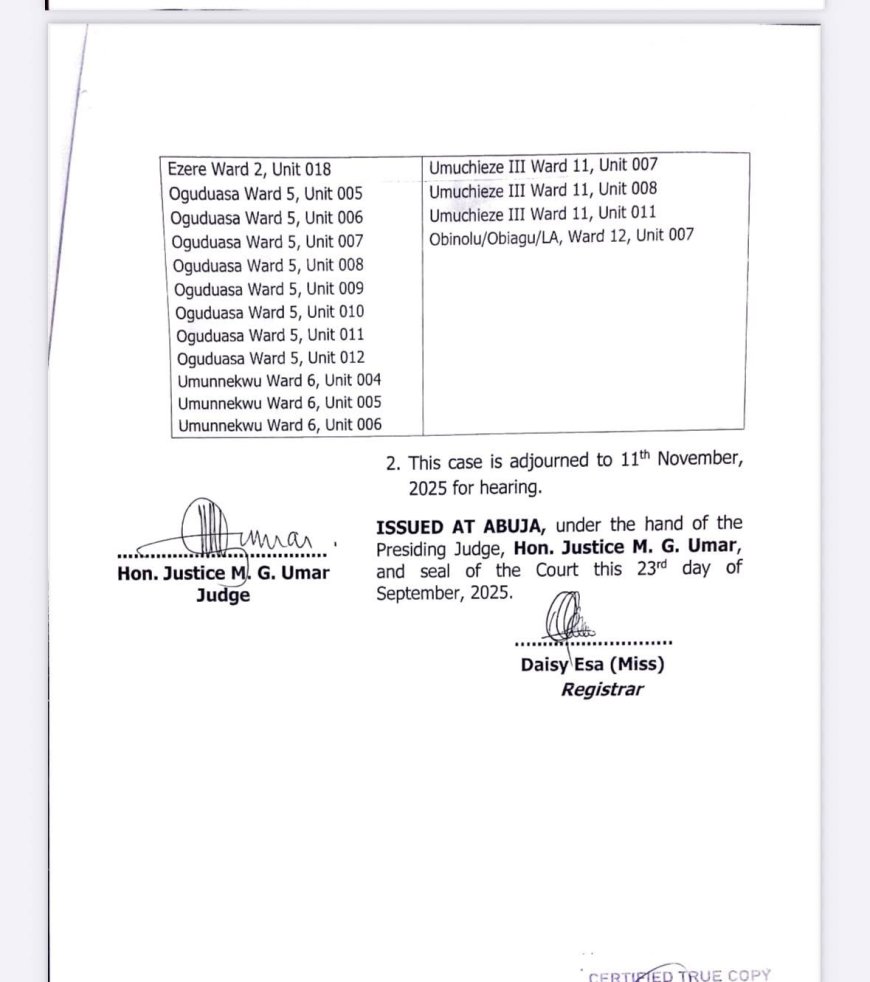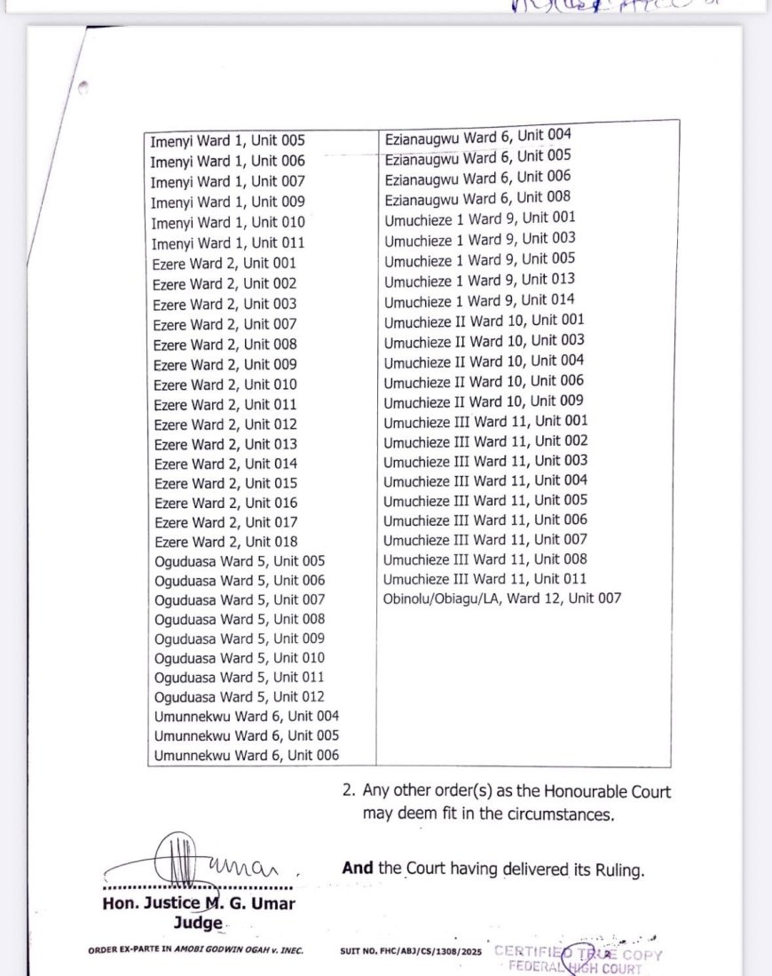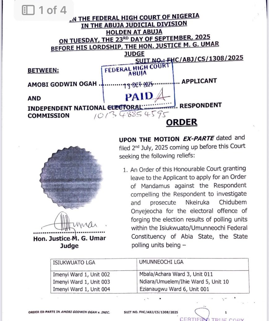 The Federal High Court in Abuja orders INEC to investigate and prosecute Minister Nkeiruka Onyejeocha over alleged forgery of 2023 polling unit results in Isiukwuato/Umunneochi Federal Constituency, following a suit filed by Hon. Amobi Ogah.