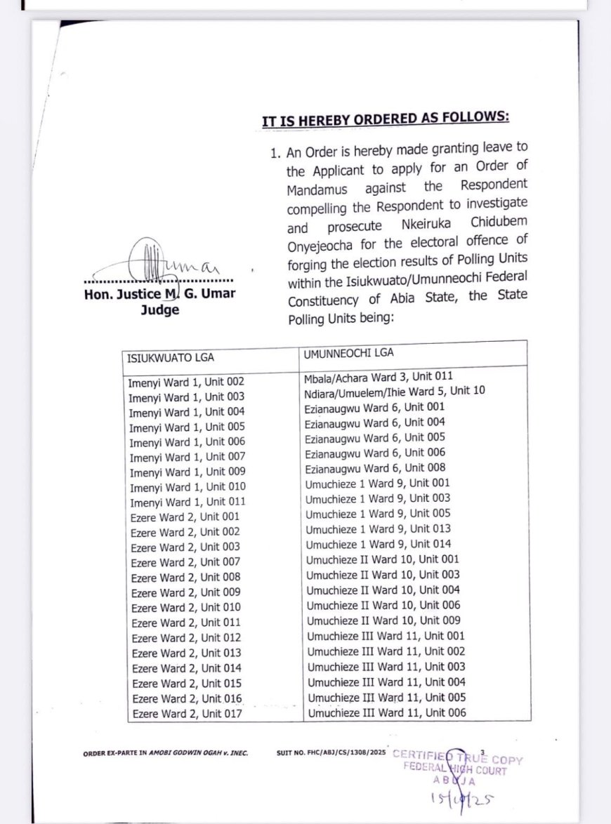 “An order is hereby made granting leave to the applicant to apply for an Order of Mandamus against the respondent, compelling the respondent to investigate and prosecute Nkeiruka Chidubem Onyejeocha for the electoral offence of forging the election results of polling units within the Isiukwuato/Umunneochi Federal Constituency of Abia State.”