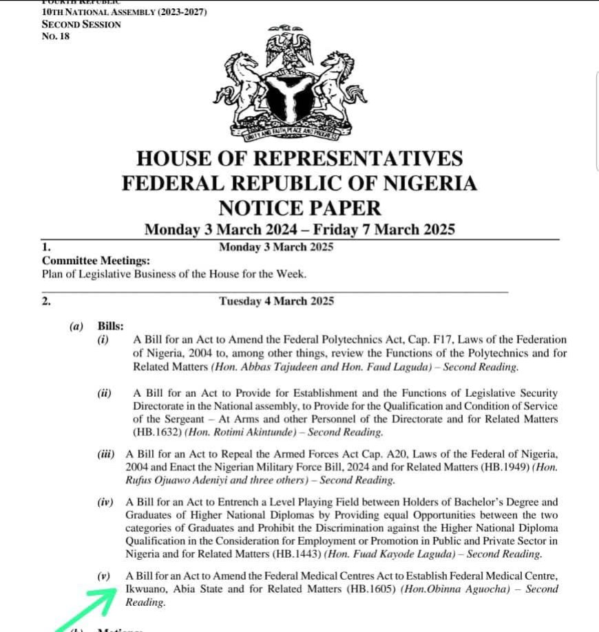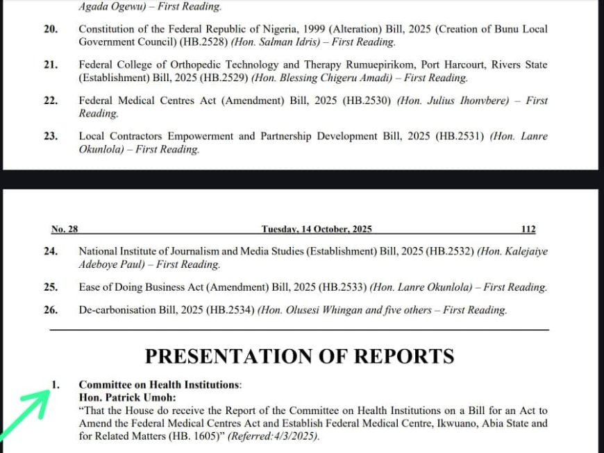The bill, titled “A Bill for an Act to Amend the Federal Medical Centres Act to Establish Federal Medical Centre, Ikwuano, Abia State and for Related Matters (HB.1605)”, was sponsored by Hon. Obinna Aguocha, the member representing Ikwuano/Umuahia North/Umuahia South Federal Constituency.