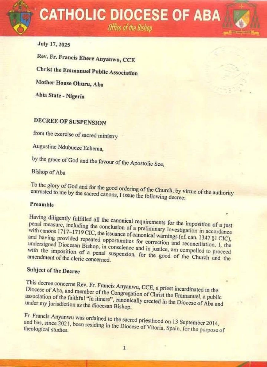 A major scandal has erupted within the Catholic Diocese of Aba as Rev. Fr. Francis Anyanwu publicly accused Bishop Augustine Echema and several priests of serious moral misconduct and cover-ups—allegations that have since gone viral and sparked widespread outrage among the Catholic faithful.