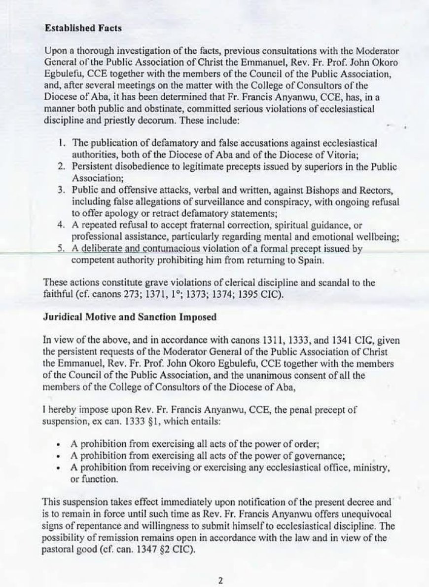 Fr. Anyanwu claimed that Bishop Echema was fully aware of these issues but chose to ignore them, allegedly due to loyalty to certain cliques within the diocesan leadership. He implied that he was being punished for challenging the status quo, while others with more severe allegations were being shielded.